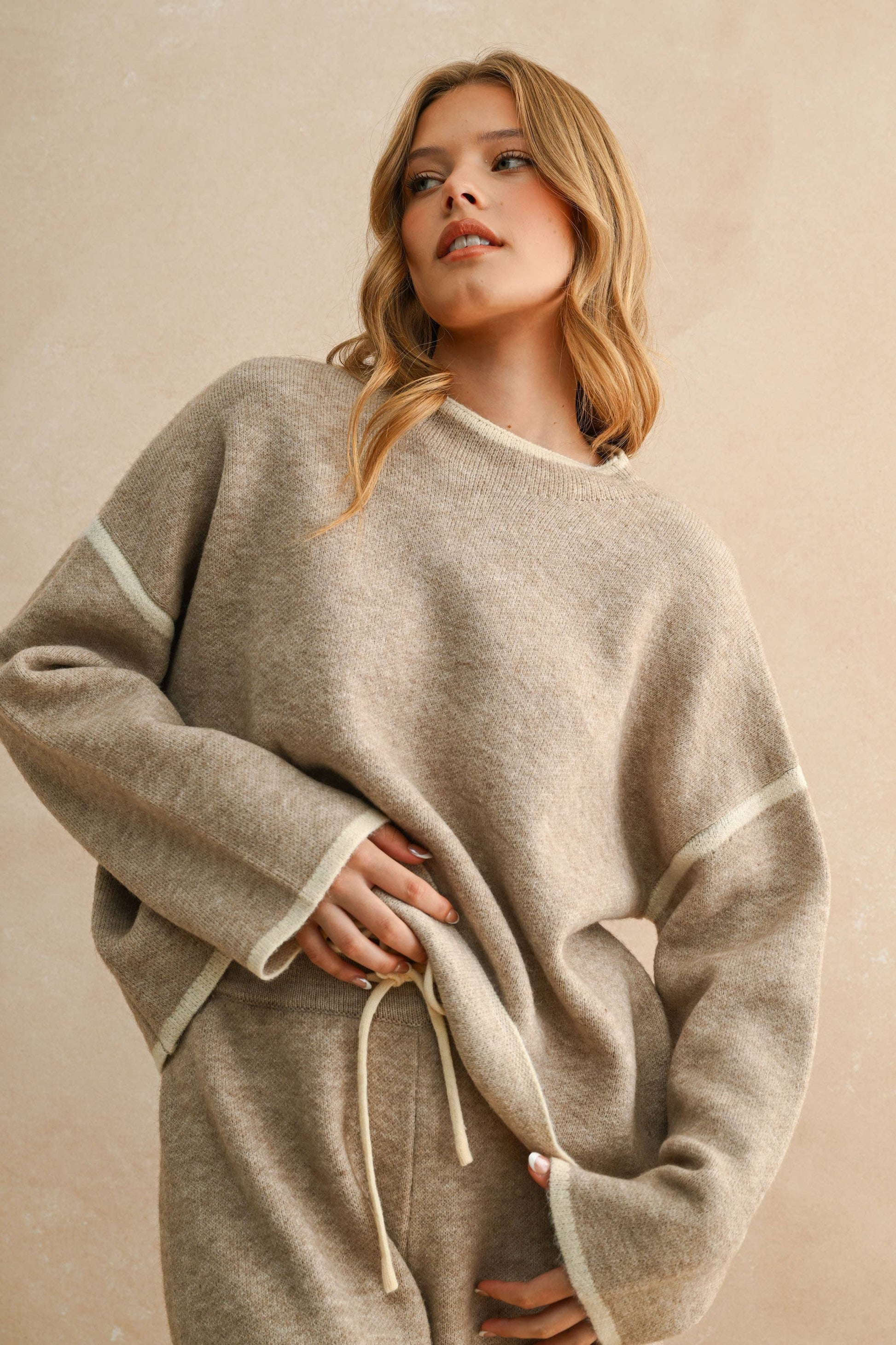 Elevate your wardrobe with this refined high-neck long sleeve sweater top, thoughtfully designed to coordinate seamlessly with matching bottoms. The sophisticated silhouette and quality construction make it an essential layering piece for any discerning closet.